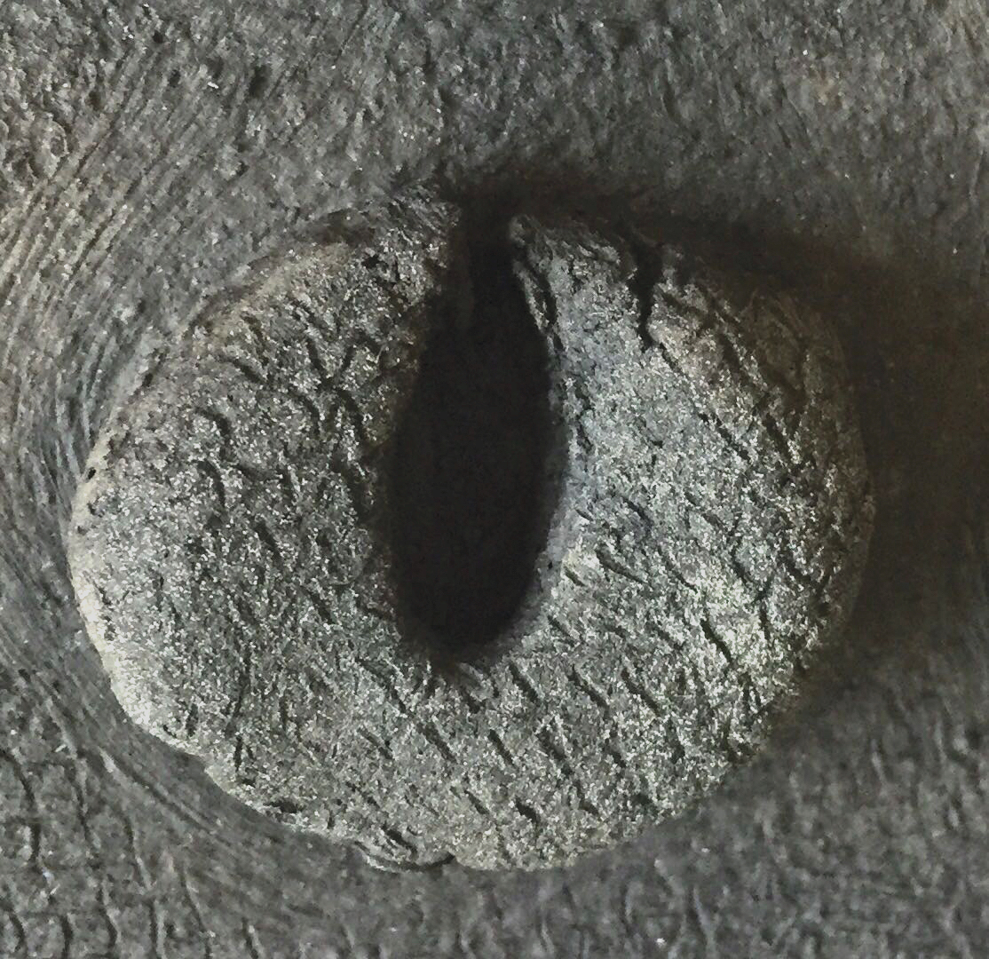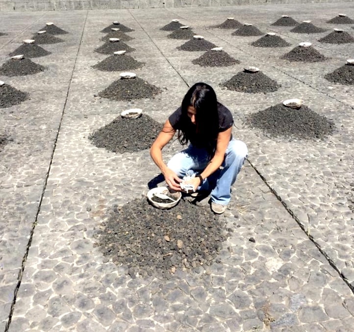 Si nos conformáramos con la definición del diccionario (“Senos: Cada una de las mamas de la mujer”), omitiríamos el prodigioso imaginario, la mística y el erotismo que desde tiempos inmemoriales acompañan esta parte delicada de la anatomía feminina. Más allá de la connotación científica, clínica u obstétrica, la instalación Ofrenda/Senos de obsidiana convoca a la mitología que envuelve el pecho en tanto que símbolo de amor, fertilidad, protección y sustento: está dedicada al aspecto nutricio y fusional de la Gran Madre, es decir a la Tierra.