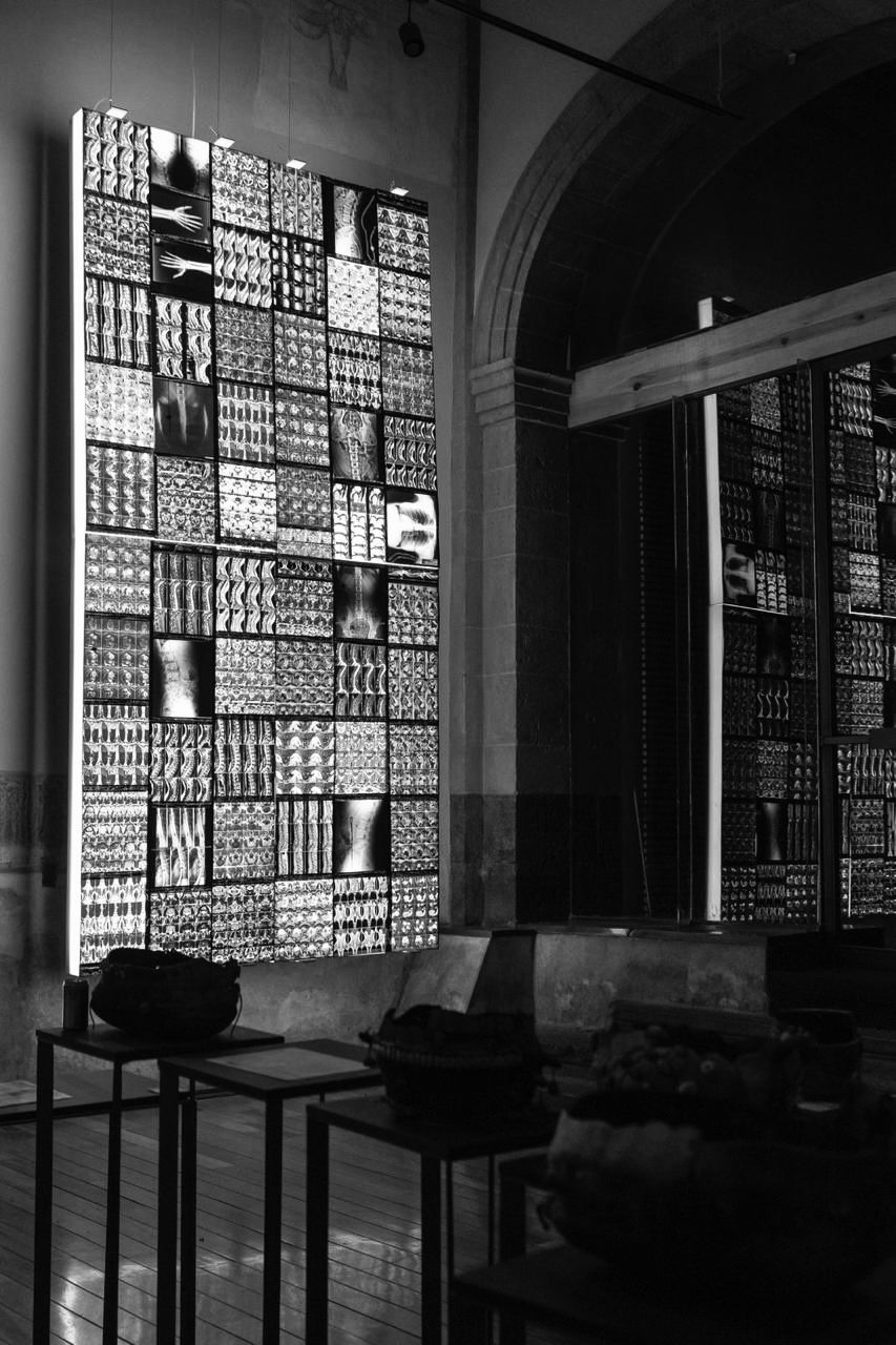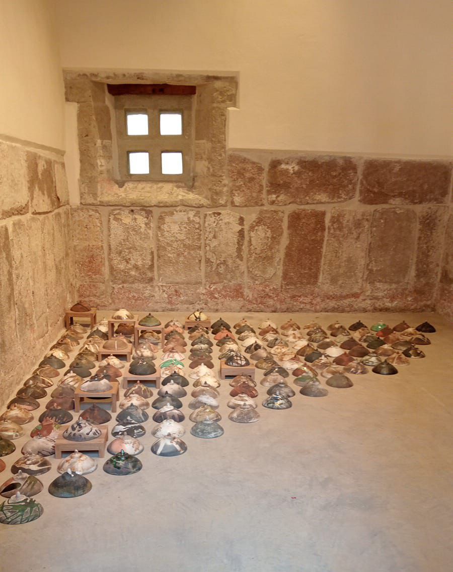 Para concebir este mar de senos, Adelia Sayeg moldeó las concavidades con barro y saliva, cubrió sus grietas con fibras y textiles, las pintó en tonos arcillosos o rojizos, esgrafió algunas con frágiles motivos geométricos, y dispuso el conjunto en una cuadrícula ritual. Nos convida a sumergirnos en una dimensión sagrada de lo femenino y valorar su vigencia. Orienta nuestra conciencia a combatir los pensamientos de derrota, y nuestra sensibilidad a fomentar la armonía entre los seres vivos, la naturaleza y el cosmos, en una perspectiva de sanación y concordia universal. Ahora montada en lo que antaño eran celdas carcelarias, la instalación Ofrenda/Senos de obsidiana cobra una fuerza liberadora.
